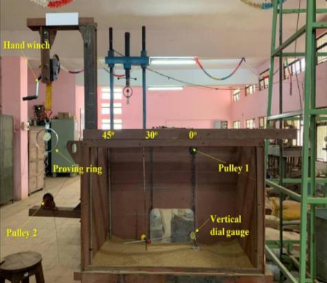 An experimental investigation is performed on a small-scalemodeltankmadeofmildsteel,measuring1.2m ×0.75m×1.5m,withathicknessof10mm.Thedimensions of the model tank are chosen to minimize the impact of boundary effects. Reaction frames are used and securely attached to the model tank on both sides. One end of the reaction frame is connected to a pulley and rope system, whilemodelpilesareattachedtotheotherend.Aproving ring is used to measure and record the force needed for extraction.Thereactionframeislabelledwithanglesof0°, 30°,and45°toshowanobliqueloadingarrangement,with theverticalaxisservingasareference.Twodialgaugesare employedformeasurements:oneispositionedverticallyat thetopofthepiletomeasureverticaldeformation,whilethe other is fixed horizontally to measure horizontal deformation. Fig -2displays theactual imageshowing the axialandobliquepull-outloadingarrangement.