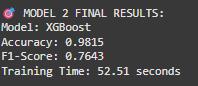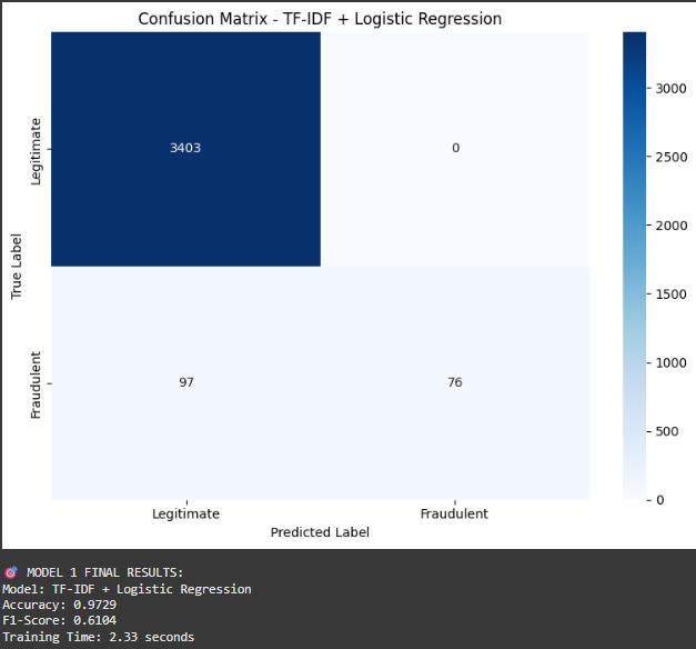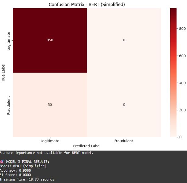 The three models were evaluated based on several performance metrics,includingaccuracy,precision,recall, F1 score, training time, and prediction time. The TF-IDF with Logistic Regression model achieved an accuracy of 96.34 percent, a precision of 85.23 percent, a recall of 78.92 percent, and an F1 score of 81.95 percent. It was alsothefastestmodel,withatrainingtimeof2.45seconds and a prediction time of just 0.08 seconds. XGBoost delivered the best overall performance, with an accuracy of97.21percent,precisionof88.91percent,recallof84.56 percent, and an F1 score of 86.68 percent. However, it required more training time at 15.23 seconds and had a prediction time of 0.21 seconds. The BERT-based approach or Enhanced TF-IDF model showed an accuracy of95.98percent,precisionof82.34percent,recallof80.12 percent,andanF1scoreof81.21percent.Thismodelhad the highest computational cost, with a training time of 45.67 seconds and a prediction time of 1.34 seconds. These results highlight the trade-offs between model accuracy and efficiency for different deployment scenarios.