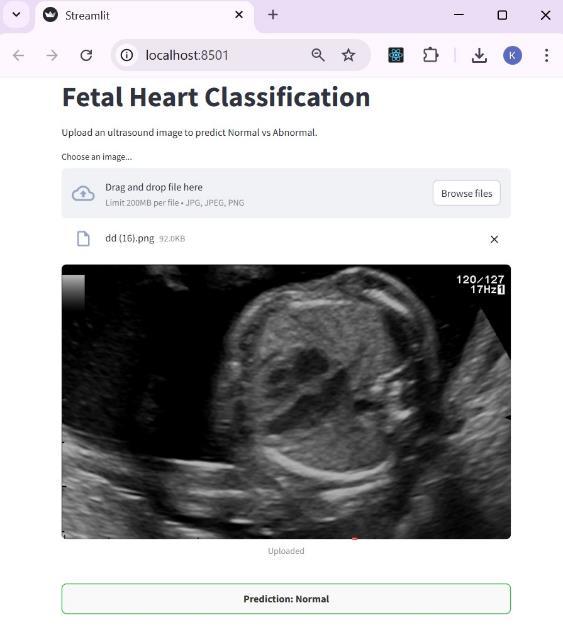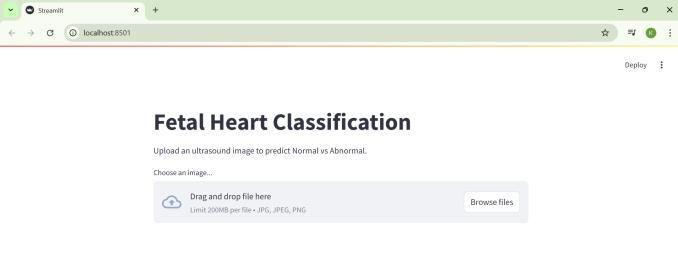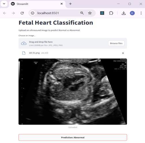 The application was developed with Streamlit, whichisknownasa webframework forPython.Ithas an intuitive interface which allows users to upload a fetal heart ultrasound image and obtain a prediction resultalmostimmediatelyNormalorAbnormal.Dueto its simple design, the app is classified as lightweight and easy to use. It is browser-based, meaning that it can be accessed easily during consultations, making it effortless to use during clinical assessments, even withoutextensivetechnicaltraining.