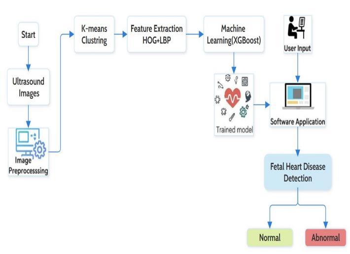 Abstract -An Early detection of congenital heart defects (CHDs)isessentialtoallowprenatalcareandmedicaltreatment in time. This system is a machine learning-based system used for fetal heart assessment from ultrasound images. The system works on an end-to-end basis, processing images through various stages, including preprocessing, feature selection, and classification, to separate normal from abnormal fetal heart images. The workflow begins with image enhancement techniques that are used for preprocessing to maintain uniform conditions across the images. Then, K-means clustering is implemented to automatically cluster the images into normal and abnormal categories. To assist in classification, features are extracted with the help of two complementary approaches: Histogram of Orientated Gradients (HOG), which highlights the shape and structural patterns of the heart, and Local Binary Patterns (LBP), which emphasize the texture details. Finally, these features are fed to an XGBoost classifier to distinguish between the classes. This proposed approach thus allows clinicians to reach fast yet reliable decisions, which in turn ensures better prenatal outcomes and early treatment planning ofcongenitalheartdiseases.