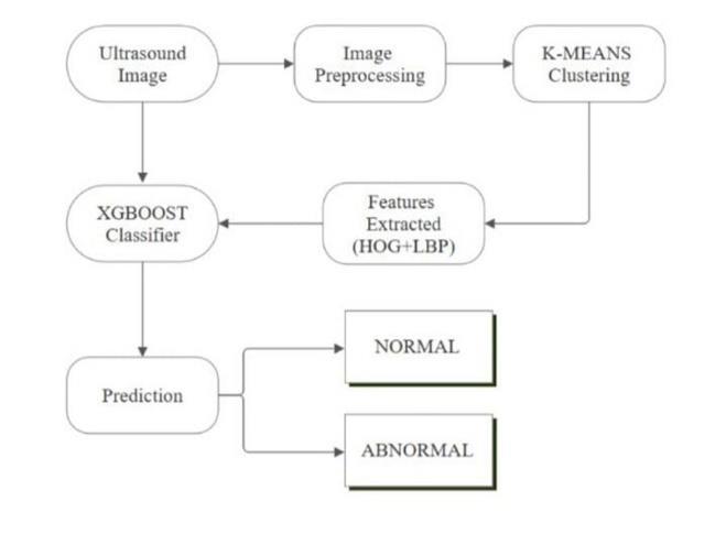 Ultrasound Image ā Image Preprocessing ā K-Means Clustering ā Feature Extraction (HOG + LBP) ā XGBoost ClassifierāResult