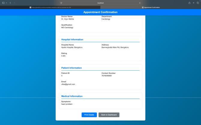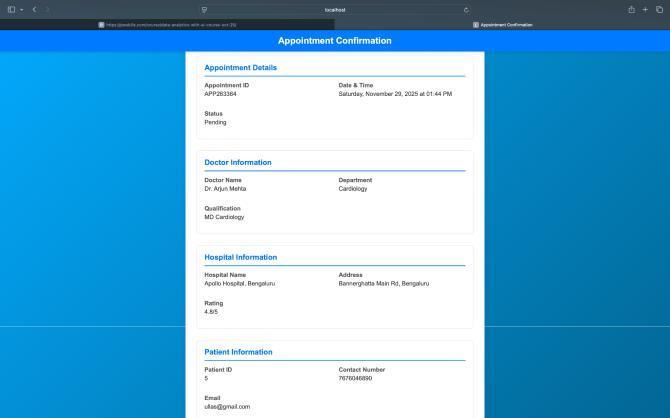 The development of the Doctors OPD Appointment Management System demonstrates how digital transformation can significantly improve healthcare efficiency, accessibility, and patient satisfaction. By integrating a streamlined appointment workflow, real-time doctor availability, secure data management, and automated communication features, the system effectively reduces operational challenges commonly faced in traditional OPD environments. The use of moderntechnologies,astructureddevelopmentmethodology,andstrongsecuritypracticesensuresreliability,scalability, and long-term usability. Overall, the system enhances coordination between patients, doctors, and administrators while promotingfasterservicedelivery,reducedwaitingtimes,andimprovedhospitalmanagement.Thisprojecthighlightsthe potential of technology-drivensolutionsto support betterhealthcare experiencesandlays a strong foundation forfuture enhancementssuchasadvancedanalytics,telecomsiltation,andAI-drivenpatientinsights.