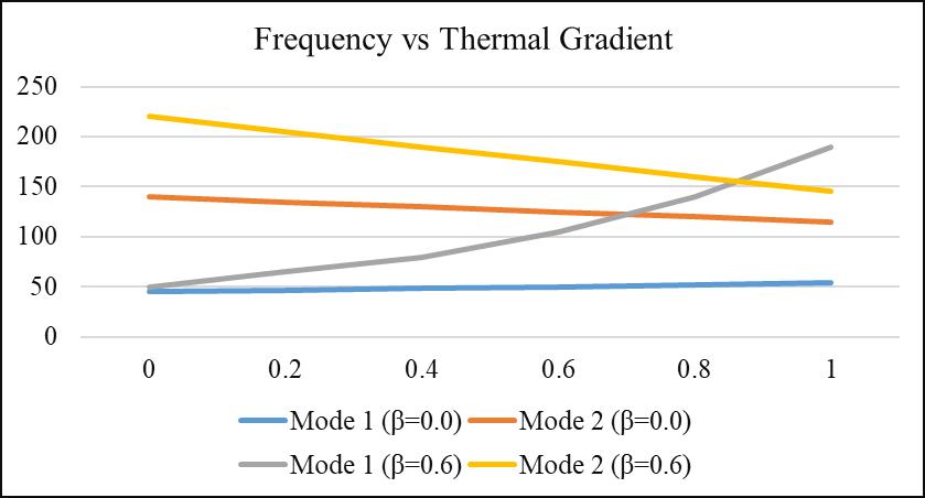 Theanalysisrevealsthatthermalgradientssignificantlyaffectthestiffnessanddynamicresponseoftheplate.Asthethermal gradient increases, the natural frequencies tend to decrease, indicating a softening behavior due to temperature rise. Conversely,anincreaseinthetaperconstantenhancesthestiffnessoftheplate,leadingtohigherfrequencyvaluesforboththe firstandsecondmodesofvibration.