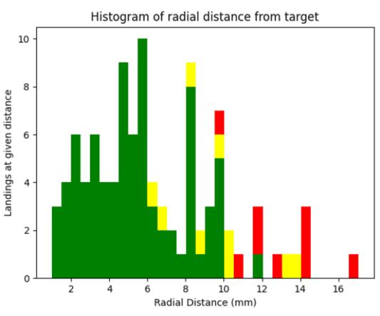 Theresultswerevisualizedinascatterplot(Figure6)anda histogram (Figure 7). Green landings clustered near the transmittercenter;redonesshowedpooralignment.These results highlight the importance of enhancing landing accuracytoimprovechargingreliability.