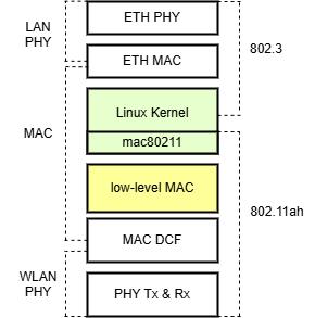 The software architecture is also divided to run on two processors, with the lower CPU's software executing initialization and running the peripheral hardware of the lower processor, handling 802.11ah low-level MAC layer operations. The upper processor's software architecture incorporates a Linux operating system, using the mac80211 subsystem in the Linux kernel along with the upper processor's peripheral hardware to handle packet transmissionandreception[15].