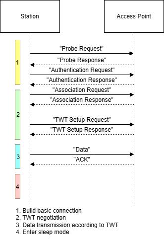 TargetWakeTime(TWT)allowsAccessPoints(AP)and Stations to negotiate communication periods, where devices only wake up to transmit and receive data during scheduled TWT periods, remaining in deep sleep mode at other times, thereby significantly reducing power consumption.