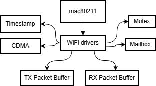 The mac80211 subsystem controls the FPGA hardware and conducts data transfer with the upper CPU through custom-writtenWiFidrivers.Thisdrivercontainssixmain components: Mailbox, Mutex, CDMA, Timestamp, Rx PacketBuffer,andTXPacketBuffer.Amongthese,Mailbox handles communication between upper and lower CPUs; Mutex ensures that upper and lower processors don't simultaneously access the packet buffer; CDMA executes data transfer from memory to packet buffer; Timestamp provides the necessary timestamps for packet transmission; and RX/TX Packet Buffer serves as packet bufferspaceforupperandlowerprocessors.