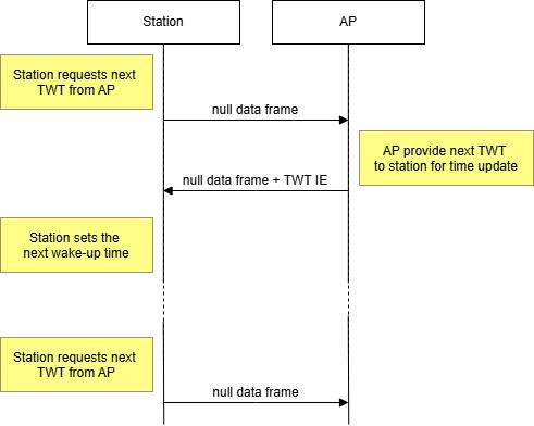 Implicit TWT: After setting up the initial TWT service period,theAPandNon-TIMstationcalculatethestarttime of the next TWT Service Period when the current one begins.ThecalculationaddstheTWTWakeIntervaltothe currentTWTvalue,makingImplicitTWTaperiodicTWT.