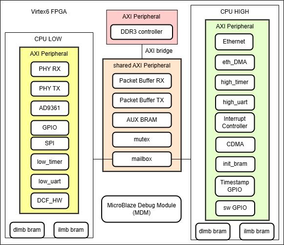The upper-layer CPU's AXI Peripheral needs to connect to multiple components: Ethernet, Direct Memory Access (DMA),InterruptControllerCentral DirectMemoryAccess (CDMA, which works with CPU HIGH to write data to the Packet Buffer TX), and Timestamp GPIO (for generating timestampsrequiredforwirelesspackets).Thelower-layer CPU's AXI Peripheral mainly connects to physical layer hardware and antenna hardware, such as AD9361 and DCF_HW, responsible for physical layer reception and transmission, as well as real-time antenna-related tasks. The Shared AXI Peripheral coordinates communication between the upper and lower CPUs, including mailbox, packet buffer bram (Packet Buffer Rx and Packet Buffer Tx),andDRAM,asshowninFigure2[13][14].