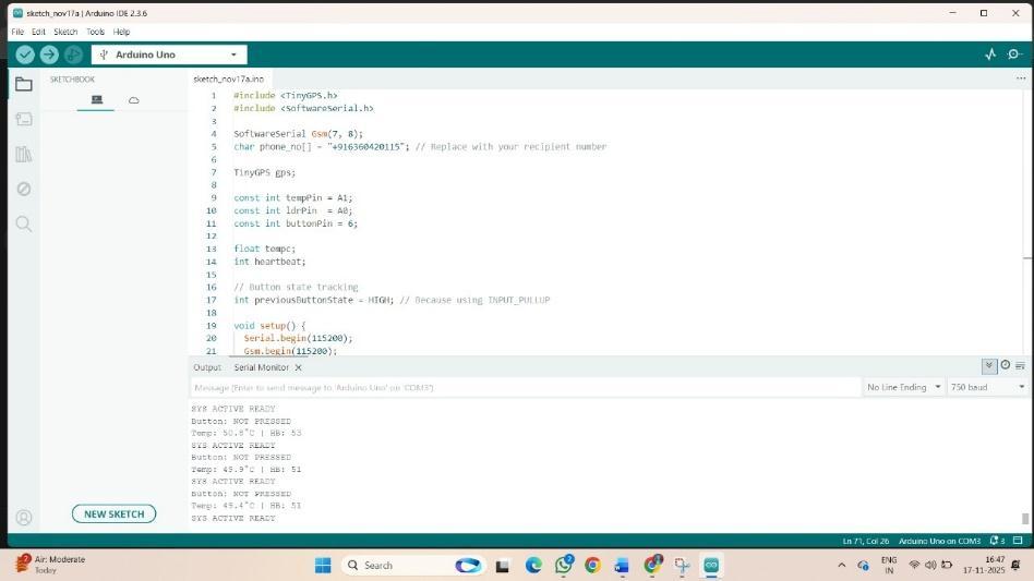 3. Emergency Detection and Response: The system effectively identified abnormal health conditions and SOS buttontriggers,sendingimmediateSMSalertsthroughtheGSMmodule,includingliveGPScoordinatesforrapid response.