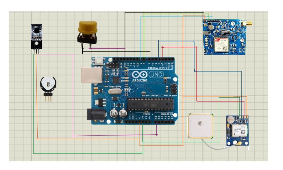TheblockdiagramoftheSoldierHealthandPositionTrackingSystemillustratestheintegrationoftheArduinoUNOasthe centralprocessingunit,managingtheconnectionsofvariousbiomedicalsensorsandcommunicationmodulesforeffective soldiermonitoring.Thepulsesensorcontinuouslymeasuresthesoldier’sheartrate,whilethetemperaturesensortracks body temperature to identify any abnormal health conditions. These sensors work together to provide real-time health analysisessentialforsoldiersafetyduringmissions.