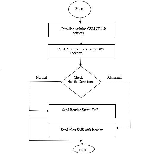 Thesystembeginsitsoperationbycontinuouslycollectingdatafromthepulsesensorandtemperaturesensortomonitor thesoldier’svitalhealthparameters.Atthesametime,theGPSmoduleupdatesthe soldier’sreal-timecoordinates.Ifthe health readings remain within safe limits, the system continues regular monitoring. However, if an abnormal heart rate, unusual body temperature, or sudden fluctuation is detected, the system immediately enters emergency mode. The Arduinothenpreparesthelatesthealthdata alongwith GPScoordinatesandsends themvia theGSMmoduleasanalert message to the control room. If no abnormal condition is detected, the system continues normal health and location trackingthroughoutthesoldier’smission.
