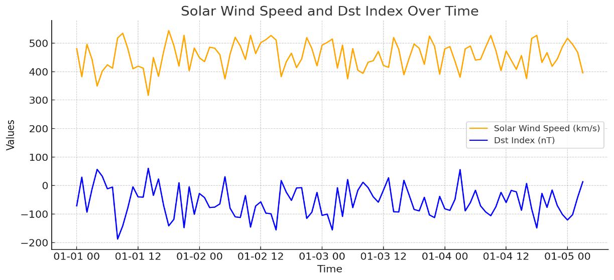 Thefirststepinunderstandingsolar-inducedgeomagneticvariabilitywastoassessthecorrelationbetweensolarwindspeed andtheDstindex.AsshowninFigure1,thereisaclearinverserelationship,whereelevatedwindspeedsoftencoincidewith dropsintheDstindex anindicationofgeomagneticstormconditions.