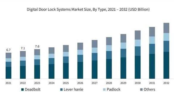 Theglobaldigitallocksystemmarketwasvaluedto7.6 billionUSDin2023andisestimatedtogrowataCAGRof over7.4%from2024–2032.Thedigitaldoorlocksystem industry is growing due to increased demand for smart home security solutions. Digital door locks, featuring biometricaccess,remotecontrol,andactivitymonitoring, offerbettersecuritythan traditionallock,makingthema popularchoice.LatinAmericaisexpectedtogrowfrom9% to11%bytheendof2032.Indiaisexpectedtowitnesshigh growthwithaCAGRof14.5%bytheendof2032.
