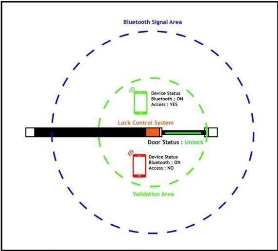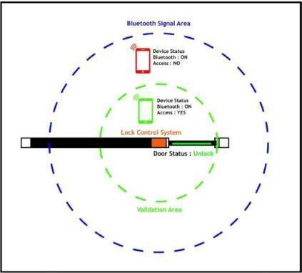 TheuserofaccessislocatedonBluetoothsignalarea andtheuserofnoaccessislocatedonthevalidation area.Theconditionidentifiesthattheuserofaccessis located on the Bluetooth signal area, yet the system hasnotgiventhecommandtoopenorlockthedoor. Theuserofnoaccessislocatedonthevalidationarea, yettheidentityoftheuserdetectedontheareadoes notmatchtheidentitysavedontheserver,sothedoor lockisstillonthelockedstatus.