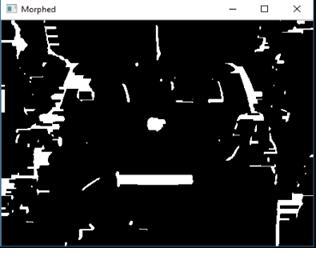 4. Morphed Frame: Dilation operation is applied on this image for detection of candidate plate area. After this the unwanted portion of image is removed by using opening operation and finally the candidate plate region is detected by using morphological erosion operation. Then morphological opening and morphological erode operations are used for detection of exact candidate plate area(NPD)anditsresultisshowninFigure5.