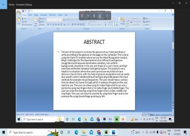 ThemainfocusofstudyinthefieldofHumanComputerInteraction(HCI)inrecentyearshasbeenonanaturalinteraction technique. Applications of real-time hand gesture-based recognition have been implemented in many settings where we interface with computers. The detection of hand motions is dependent on a camera. The primary way of engagement involvescreatingavirtualHCIdeviceusingawebcamera.Inthiswork,handmotionsemployedincontemporaryvisionbased Human Computer Interaction techniques are examined. This project is very helpful in a situation where the users cannotuseanykindsofinputdevicesortouchthem,withthehelpofgesturerecognitiononecaneasilydoaspecificaction neededwithouthavingtophysicallyaccesstheinputmethodsforexamplemousekeypadetc.Theusercandrawusinghis indexfingerandhecanuseapointerbyusingtwofingersthatishisindexfingerandmiddlefinger.Theusercanundothe drawingusingthreefingersthatisindex,middleandringfinger.Theusercanmovetonextfilebyusinglittlefingerandto thepreviousfileusingthumbfingerpointingtoleft