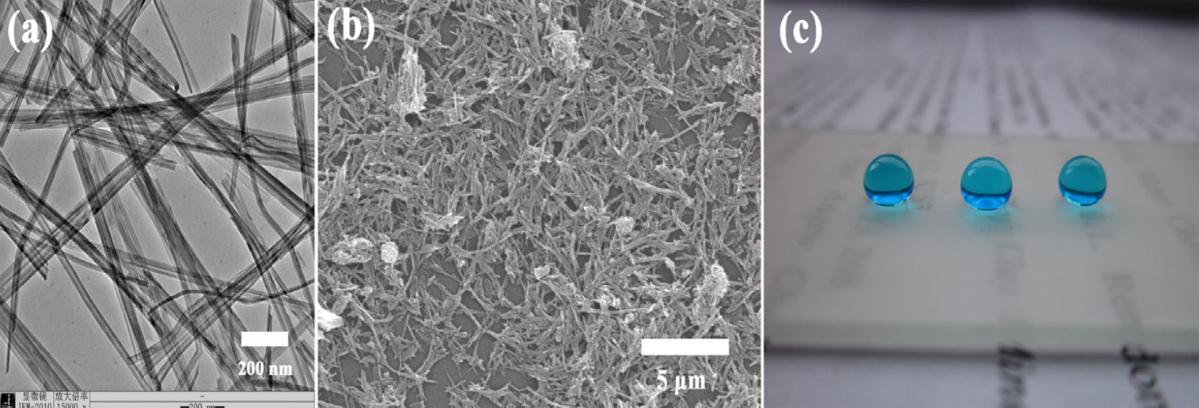 Xia Zhang et al could successfully generate SHP coating with a water contact angle of 158 ± 2° and a sliding angle of 5° [15].TheyhadcharacterizedthecoatedsurfaceusingTEMandSEManalysis.Fig.3.3displayedhereshowstheTEMimageof theTiO2 nanowires.Fromthestudies,itwasconfirmedthesolidstructureofthenanowireswithadiameterof20–30nm rangeandlengthofabout5µmtomorethan10µm.Thefig.3.3b)showstheSEMimagesofthecoatedsurfaceandcouldsee theaccumulation ofTiO2 nanowiresthatform dendritestomake the surface roughened. Thesuperhydrophobicityofthe surfacewasclearlydefinedbytheimageofsphericaldropletsofwaterontheTiO2 nanowirecoatingasucanseeinfig.3.3C).