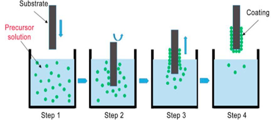 Thesol-gelprocessisthemostpreferredmethodfordevelopinggoodqualitycoatings.Theinorganicsilicaandorganically modifiedsilanescompriseahybridsol-gelthatformsa3Dnetworktoimpartsuperhydrophobiccharactertothecoatedsurface [1]. Spray coating, spin coating, and dip coating are the 3 techniques that can be used to deposit the sol-gel on various substrates [9]. Fig.2.6 showstheschematic representationoftheSol-gel coatingtechnique. S.Liu et al [23] reportedthe synthesisoftransparentSHCviasol-gelprocessingoflong-chainFluoroalkylsilane.Thecoatingmixwaspreparedbyadding ethanol(solvent),ammonia(catalyst),andwater.Thefinalsuperrepellentsurfacewasachievedbytheimmersionofglassin thepreparedsolutionfordifferentdepositiontimes.
