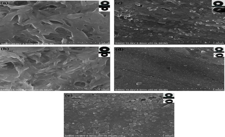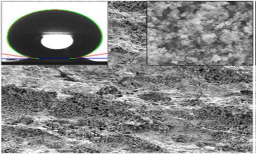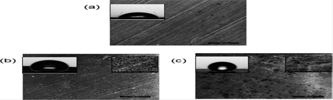 Slightmorphologicalchangeswereobservedonthealuminiumwhenimmersingfor30sec(fig.3.1.(b)).Whentheyincreased theimmersingtimeto60sec,craterlikemicrofeatureswereseenclearlyinhighmagnifiedSEMimagesasshowninfig.3.1(C). Themajorincreaseinwatercontactanglewasnoticedwiththeincreaseinimmersingtimeforbothprocesses[13].