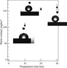 Takahiro Ishizaki and his co-workers [26] had confirmed the superhydrophobicity of the film they had prepared by the topographicstudiesandhigherwettabilityofthesurface.Thedepositiontimeplaysamajorroleindeterminingthesurface roughness and the superhydrophobicity of the coating. As time increases, water contact angle increases resulting in superhydrophobicityasshowninfig.3.12.Thedecreaseincurrentdensityofthecoatedsurfacebymorethanthreeordersof magnitudeasthatofuncoatedAZ31alloyhadconfirmedtheimprovementincorrosionresistance.Thechemicalstabilityofthe coatingwasexaminedunderdifferentPH.Theresultsshowedexcellentstabilityinbothacidicandneutralaqueoussolutions, butlowerstabilityinalkalineaqueoussolutions.Higherchemicalstability,improvedcorrosionresistancewerethekeyresults theyhaveachievedtoexpandthecorrosion-resistantfilmsforvariousengineeringmaterials.
