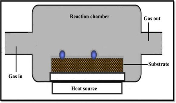 Itisaprocessinwhichgaseouselementsgetdepositedontoahotsubstratethatisplacedinachamberasshowninfig.2.7.A thin layer of coating is achieved under the reaction with the hot surface [11]. Zhengwei Cai et al [25] have successfully fabricatedtransparentSHConthecandlesootthroughCVD.TheprecursortheyhadtakenforthedepositionwasMTMSand theCVDprocesswasfollowedbycalcinationat450°C.