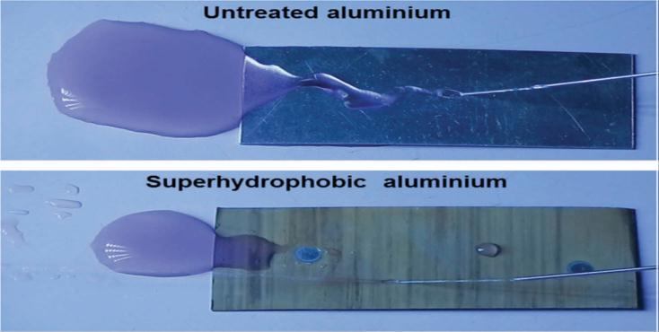 Theeffectivewaterrepellencyofthesuperhydrophobiccoatingwasexhibitedunderahigh-speedwaterjettestasshowninfig. 3.2.Thewatergetsspreadontheas-receivedaluminium,butitbouncesintheoppositedirectiononthecoatedaluminium surface[13].