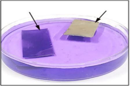 Thefloatingtestwasdonetoexaminethefloatingabilityofthecoatedsample,theuncoatedsamplesunkrapidlyandthe coatedsampletofloatonthesurfaceofthewaterasshowninfig.3.6.Theyhadstudiedtheanti-corrosionpropertyofthe superhydrophobiccoatingthroughanelectrochemical experimentinPotentiostatbyusing3.5(w/v)%NaCl solutionfor 30min. The coated sample had shown an increase in corrosion potential and a decrease in current density as that from uncoatedsteelwhichconfirmedtheanti-corrosionpropertiesofthesuperhydrophobicsteel.TheSHPcoatedsteelexhibited excellent self-cleaning, anti-fogging and anti-corrosion properties, which makes the coating useful for many industrial applications[7].