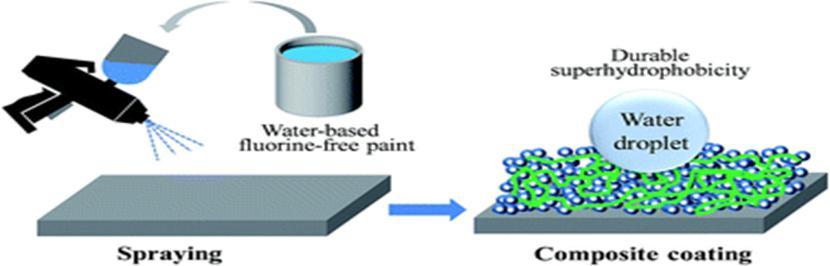 Inthistechnique,the solutionwhichisto becoatedis sprayed onto a substrateas seenin fig.2.4.Thecoating precursor requiresheatingormeltingpriortothesprayingprocess[11].KonXuetal[18]havedevelopedacolourfulsuperhydrophobic concretecoatingonanordinaryconcretebysimplespraycoatingtechnique.Theyusedamixtureofament,sand,water,based stoneprotector,anddyesforconcretecolouring.Themixturewasgroundintopowdersandsprayedontothesubstratebya sprayerwithhighforce.Polizosetal[19]havedevelopedaspraycoatingsystemtodepositSHCtransparentsilicananoparticle filmonglasssubstrates.