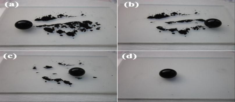 Theself-cleaningfunctionofthesuperhydrophobiccoatingsurfacewasstudiedwithgraphitepowderascontaminants.The self-cleaningprocessisshowninfig3.4.Thecoatingwhichisbeingscratchedbymechanicalmeanscanberegeneratedby immersing in TiO2 nanowire suspension and drying. The regeneration was easy and it will meet the future needs in the applicationofsuperhydrophobicity[15].