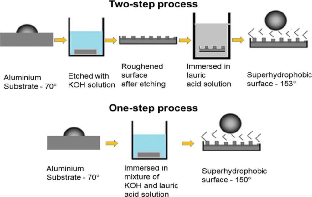 Itistheconventional coatingtechniqueinwhichthemetal isimmersedina mixtureforsometime[11].Therearetwo approachesinetchinga)One-stepprocessand2)Two-stepprocessasshowninfig.2.1.Varshneyetal.[13]studiedthetwo-step processbyimmersingAlsubstrateinKOHsolutionandtheninLauricacidsolution.Inaone-stepprocess,theyimmersedthe substrateinamixtureofKOHandLauricacidsolutionfor5–60min.HerebothrougheningandloweringsurfaceenergyofAl doneinasinglestep.Wangetal.[14]reportedasynthesisofsuperhydrophobicfilmonpureMgsurfacethroughchemical