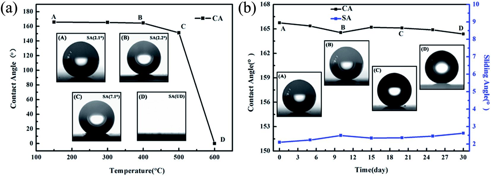 ZhengweiCaietal.[25]havefabricatedahighlytransparentsuperhydrophobichollowfilmsandachievedawatercontact angleof165.7°andaslidingangleof2.1°.Thedevelopedfilmsmaintainedgoodthermalstabilityupto500°Candturnedinto hydrophilicwhenthetemperaturehadbeenincreasedto600°C.Theyexaminedthemoistureresistanceofthecoatingby exposing it to an ambient condition for 30 days. The film had maintained the superhydrophobicity which confirmed the excellentmoistureresistancepropertyofthecoating.Boththermalstabilityandmoistureresistanceisgraphicallyshowninfig. 3.11.