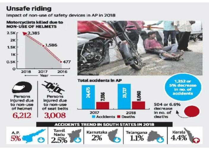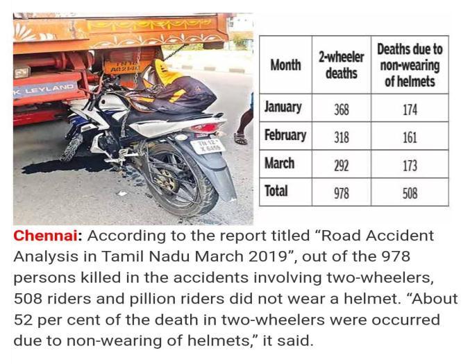 According to the report titled “Road Accident Analysis in TamilNaduMarch2019”,outofthe978personskilledinthe accidents involving two-wheelers, 508 riders and pillion ridersdidnotwearhelmets.“About52percentofthedeath intwo-wheelersoccurredduetonon-wearingofhelmets”.