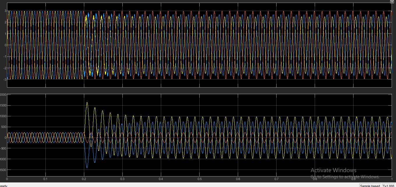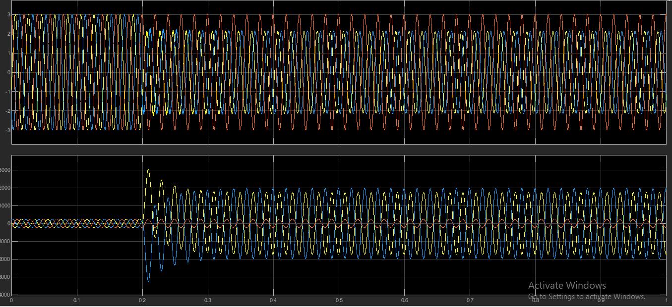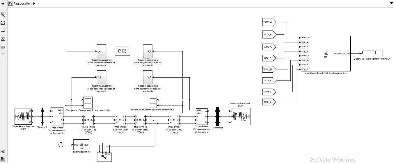 Based on the above simulink diagram the fault location is calculated by placed the fault between the phase A and B , By changing the line length of the transmission line the fault location will change accordingly with reference to A. The fault locationtimeisset at0.2sec,sointhecurrentandvoltagegraph,itshowschangesfromtime0.2seconds.