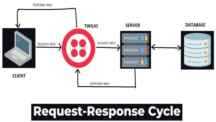 Inthis,aclientsendsarequesttotheserver through Twilio and the server sends the response to the ClientthroughTwilioandthedatabaseactsasastoredand retrieverofthedata.