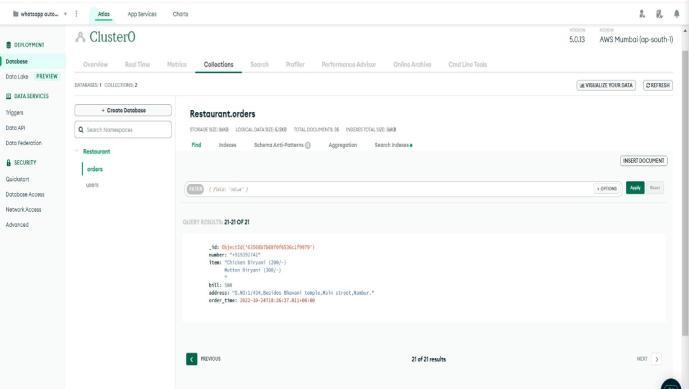InMongoDB,IcreatedadatabasenamedRestaurantwitha collectionofordersandusersinit.Inthe“orderscollection”, thedatathatisrequiredbytheRestaurantownerlikephone numbers, items, bills… etc is present, and in the “users collection”,themessagesthataresentbycustomersthrough WhatsApparepresent.