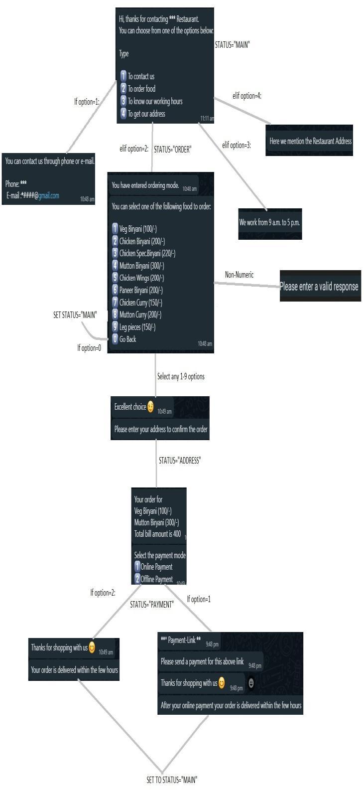 This is the flowchart of how the steps are constructed to implementtheWhatsAppAutomationBotforFoodDelivery