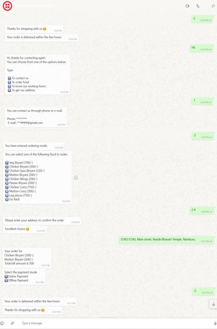 A WhatsApp chatbot is a computer program designed to automatically answer customer questions about your productsandservices,sharecontent,andsendnotifications regarding orders, payments, and shipping on WhatsApp [5].ButwiththisWhatsAppautomationbot,wecanplacean order through WhatsApp. Nowadays many members are familiarwithWhatsApp[1].So,theycaneasilyplaceorders throughWhatsApp[6].IusedTwilioformessagehandling APIandMongoDBfordatabasemanagement
