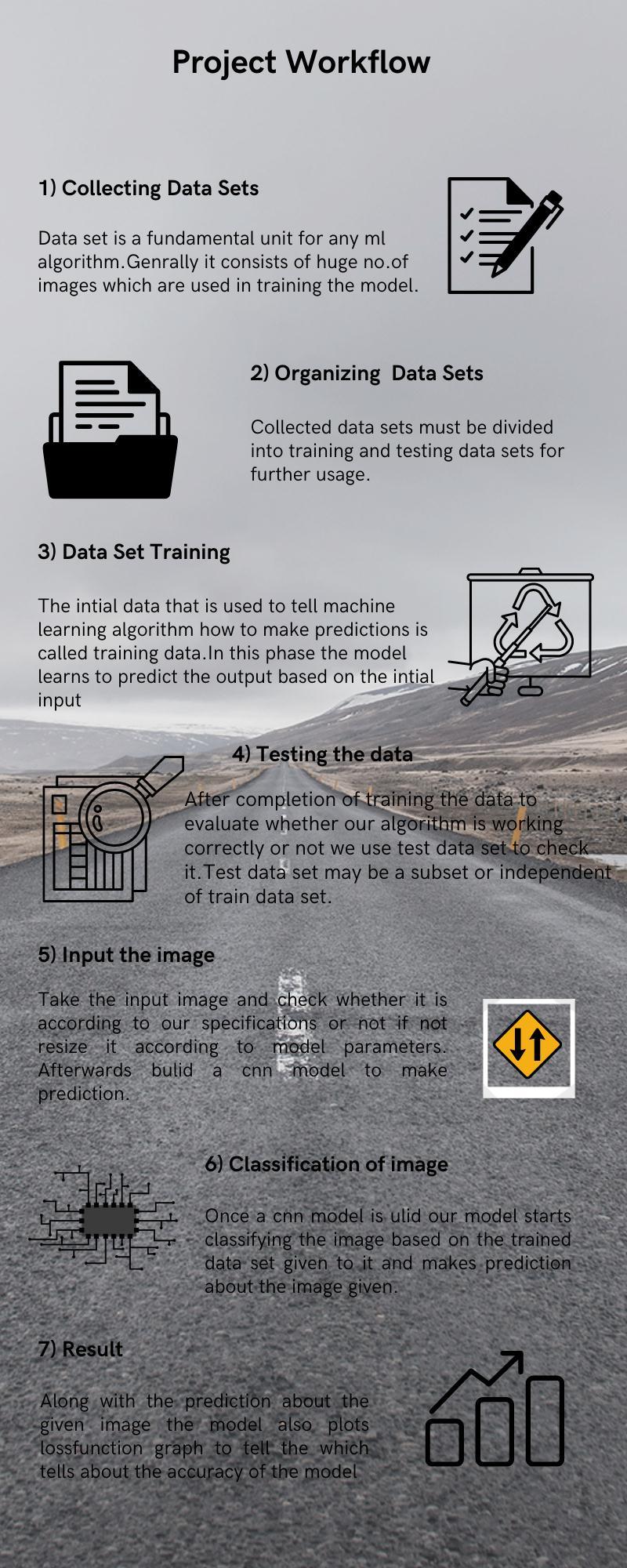 Our model mainly consists of 8 phases which are displayed in the figure below. The first phase is a collection of data sets which consists of various traffic signs in various shapes and sizes. In the second phase we trainthemodel basedontheaboveformeddataset.After thatinthethirdphasewewilltestourmodelusingadata set called test. The most important phase in our model is the fourth phase where we take input from the user and predicttheoutcomebasedonthetrainedmodel andonce asignisrecognizedtheoutputisdisplayedonthescreen.