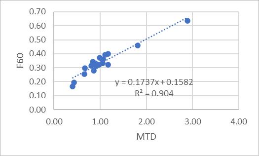 thecalculatedfrictionvaluesforslipspeed60kmph(F60). The table makes it very evident that the value of friction reduces as speed rises. Additionally from table 2,MTD is observed tohavea weak link with frictionvaluesatlower speeds,butastrongcorrelationwithfrictionvaluesathigher speeds. This demonstrates how macrotexture affects the pavement'sabilitytoresistskiddingathighspeeds.Figure6 depicts the graph for correlation between MTD and F60 values.