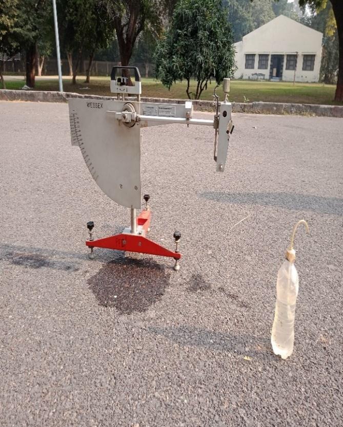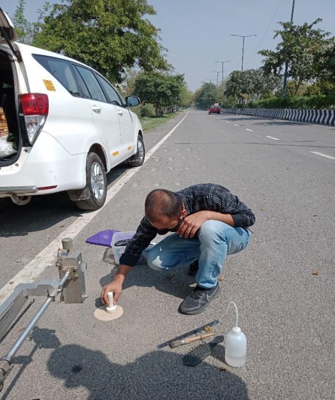 SandfromKunnur(TamilNadu),whichwasallowedtopass through a 300-micron sieve and be held on a 150-micron sieve, was used for the sand patch test (MORTH 5th REVISION).Theroadsurfacewassubjectedtoreceive25ml of sand at each place, which was then spread with a spreadingtoolintotheshapeofacircle.Thecircle'sdiameter wasthenmeasuredatfourdifferentpointsonthecircle.