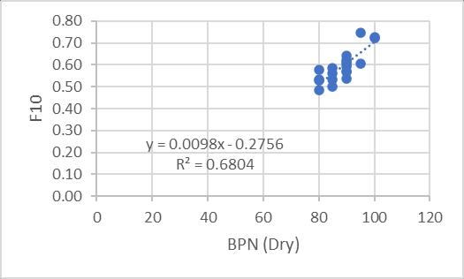 Duetotheinstrument'slowspeedandthedrypavement,the BPN readings in dry conditions are closely linked to microtexture.Itisdisplayingamoderatecorrelationforlow speed,pointingtotheroleofmicrotextureatlowspeedand dry conditions. Figure 7 depicts the graph for correlation betweenBPN(Drycondition)andF10values.