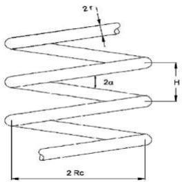 Figure1.2depictstheschematicofahelicalcoil.Inthe pipe,thereisa2rdiameter.Thecoilhasadiameterof2RC and a pitch of H, where RC is the distance between the centersofthepipes.Thecoildiameterisanothernamefor the pitch circle diameter (PCD). The curvature ratio is calculatedusingthepipediametertocoildiameterratio (r/Rc).Bydividingthedevelopedlengthofoneturnbythe pitch,orH/2rRc,thenon-dimensionalpitchisdetermined. Take into account that the coil is being reflected onto a plane that is perpendicular to the coil's axis. The helix angle may be created by extending one coil around in a planeperpendiculartotheaxis.AswithReynoldsNumber, DeanNumbermaybeusedtodescribetheflowinhelical pipes.