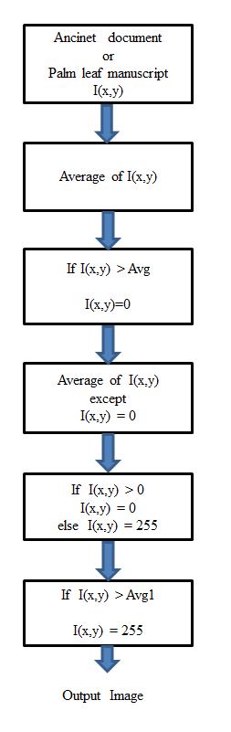 Thecurrentworkproposesusingtheaveragevalue of the image as a threshold. The image of the document undertestisbinarizedusingtheaveragevalueoftheimage Thefirstaveragevalueoftheimageisusedinthisalgorithm to complement the image and avoid unnecessary backgroundinformation.Thesecondaverageremovesany residual background noise from the first average value. During the cleaning process, some text information and background noise are removed. This algorithm has been shown to be effective on low-noise historical document images as well as palm leaf manuscripts. However, it has beendiscoveredthatpalmleafmanuscriptsrequirefurther improvement.