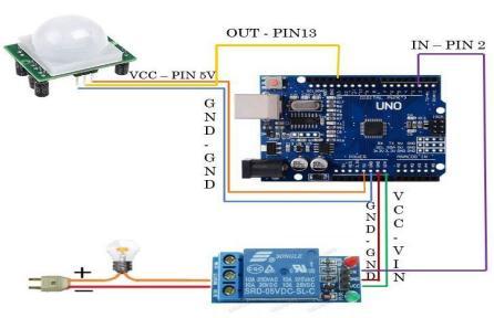 The circuit for the proposed system consists of Arduino UNO, PIR Sensor, Relay and LED. Figure 5.1, the Arduino UNO is a microcontroller board using the ATmega328 as the microcontroller. This microcontroller is developed with some basic parts that can ease in utilization. These basic parts are 14 digital I/O pins,6 analog inputs,16 MHz crystal oscillator, a USB connection, a power jack, an ICSP header, and a reset button. The most common ways to connect the microcontroller with computer using the USB cable. Besides that, it tends to be power up with a battery ortheAC-toDCadapter.ThePIRsensorisimplementedin the system is shown in figure 5.2 The figure shows the image of the PIR sensor and the function of module pin outs, controls, and indicators. The VCC, Gnd and Out are connected to the Arduino UNO board to detect objects. ThisconnectionenablesthePowerLEDtosenseobjects.If there is an object within the range of the IR Emitter LED, the PIR Emitter LED will send the rays from the object body surface to the PIR Receiver. At the same time, the obstacleLEDwouldbeon.