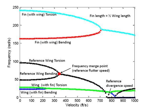 Figure 5 displays typical flutter results from the Rayleigh–Ritzquasi-steadymodelwitha90degreescan’t angletip-finlength (Lf),halfthewingsemi-span(L).The set of black lines plot the real sections of the system eigenvalues for the wing without a fin. Flutter is representedbythecoalescenceofthe wing-bendingand torsion modes. When the fin is added to the wing, four eigenvalues occur and there are two separate frequency coalescence curves. One of these curves will merge at a lower flutter speed, depending on the fin size compared to the wing. The lower set of curves, blue and green, demonstrate flutter initiation caused predominantly by wing bending torsion interaction. This motion is adjusted bythetip-fin.The secondset ofcurves, the top setofblueandredlines,mergeatagreatervelocity;this