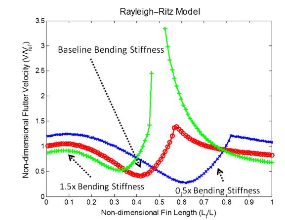 interactionisprincipallybetweenthetip-finbendingand torsionmotionmodifiedbywing-tipmotionatthetip-fin base connection. The relative placements of these two coalescence sites alter with fin length. In this scenario, theflutterspeedisloweredbytheinsertionofthetip-fin. Figure 7 illustrates flutter data from the two models illustrating how flutter speed varies as tip-fin length growswhenthetip-finisvertical.Thefindingsdisplayed inFig.8arealsostandardisedtothespeedspredictedby eachmodelforthewingwithoutthetip-fin.TheASTROS model always forecasts higher flutter speeds than the quasistatic model. The ASTROS model suggests that flutterspeedisreducedwhenevenalittlefinisaddedto the wing, however the quasi-steady model shows a modest increase in flutter speed for small fins. Both models reveal that as the fin length grows, the flutter speed is lowered to less than half of the no-fin value. These results are similar with the previously reported research in [5], [9], and [10] when the fin is very tiny. Both models imply that there are two flutter modes and indicatethatthereisafluttermodeswitchingoccurrence near Lf ∕L 0.5 when the tip-fin gets large enough to triggertheflutterinstability.