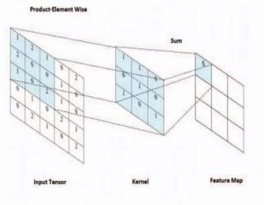 Matrix element values are updated optimally value during thetrainingphase.Takethepixeldotproductat eachmatrix value and pan the kernel window. Above theimage find a newmatrixcalledtheconvolvedimage.As a result,multiple kernels are applied to the image with multiple folded matrices.