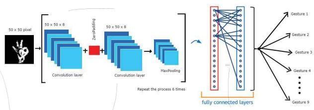 Training, ConvNets can learn these filters and functions. Thenetworksconsistofsix2Dconvolutional layerseach followed by the max pooling operator. The outputof the sixth convolutional layer is given as the input of a fully connected 9-layer network. Each layer has 512 hidden neurons;exceptforthelast outputlayer.In thishehas9 neurons, 1 neuron for each of the 9 hand gestures. The outputlayerusesa sigmoidal activation function. Tongue Activation functions are used in the remaining eight layers. In connection with this article, Each topic takes time,SeeingarealapplicationasauserisunrealisticOften does not stand up to hourly datarecording education. To solve this over fitting problem, batch normalization is usedandexplainedinmoredetailbelowsubsection.