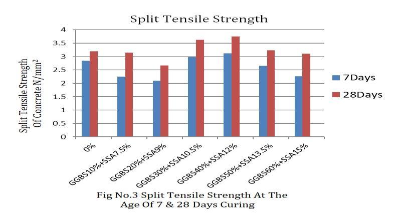 represents split tensile strength of concrete with partial replacementofcementbyGGBS0%,10%,20%,30%,40%, 50%,60%&SSA7.5%,9%,10.5%,12%,13.5%,and15%. There is an increase in split tensile strength for the replacement of GGBS and SSA. Maximum strength was obtained for 40% GGBS and 12% percentage of SSA replacementwithcement.Testresultsshowthesplittensile strengthvariedfrom2.84to3.12MPafor7daysand3.2to 3.75in28days for12%ofSSAand40%ofGGBScontent. Whentheloadreachedacertainlevelofstrength,concrete failureoccurred.WhichisshownintableNo3.